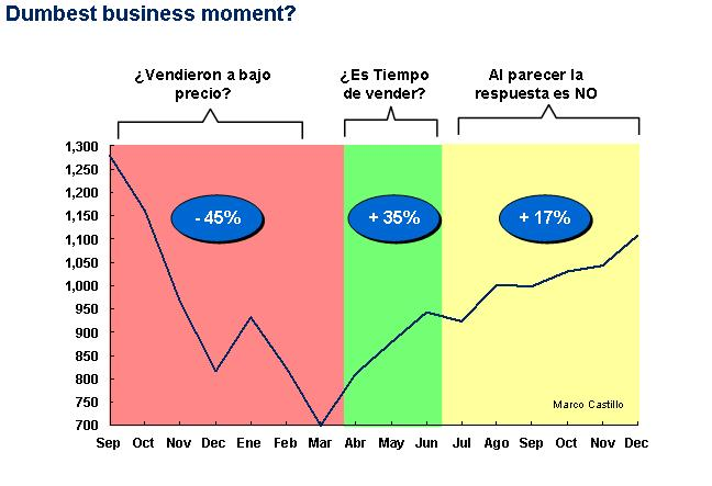 Según este artículo, uno de los “Dumbest moments in Business 2009” fue el vender acciones a inicio de año y comprar de nuevo en Junio. Según los autores del artículo, los inversionistas estaban vendiendo a precios bajos y comprando a precios altos. El artículo decía…