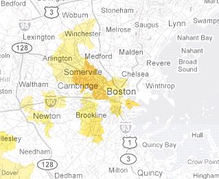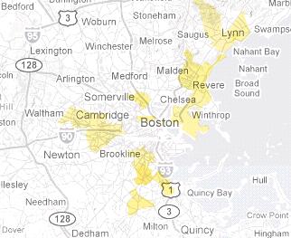 El gráfico del New York Times me parece interesante porque demuestra este efecto. Este gráfico muestra las películas DVD más rentadas por vecindario. Si hacemos un acercamiento a Boston nos podremos dar cuenta que existen tendencias muy claras.