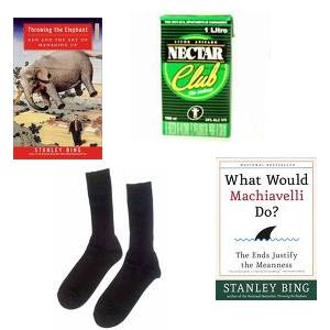 - Dos libros: “What would Machiavelli do?” y “Throwing the elephant” una broma de un compañero del trabajo que quiere prepararme para el mundo de los negocios.
