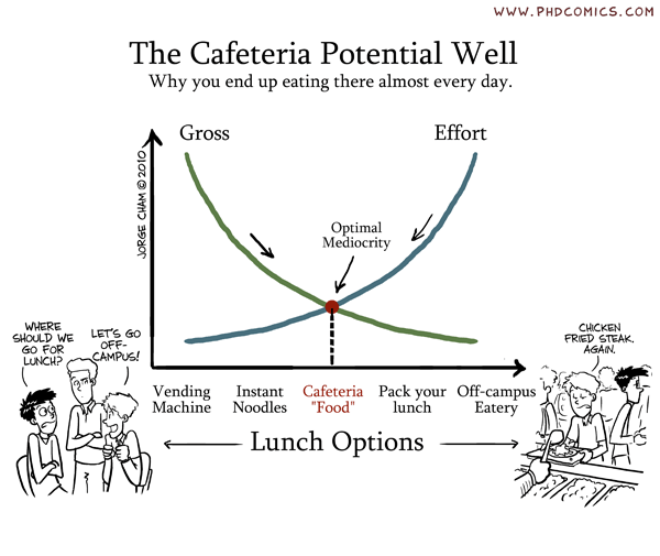 Encontré esta imagen en el blog de Esquivel y me pareció muy chistosa porque refleja en gran medida la razón por la cual como en la cafetería de mi oficina. (Pueden hacer click en la imagen para agrandarla)